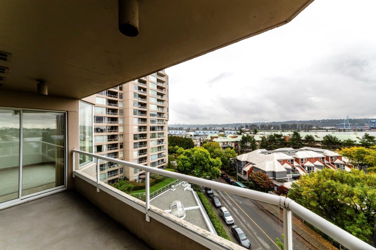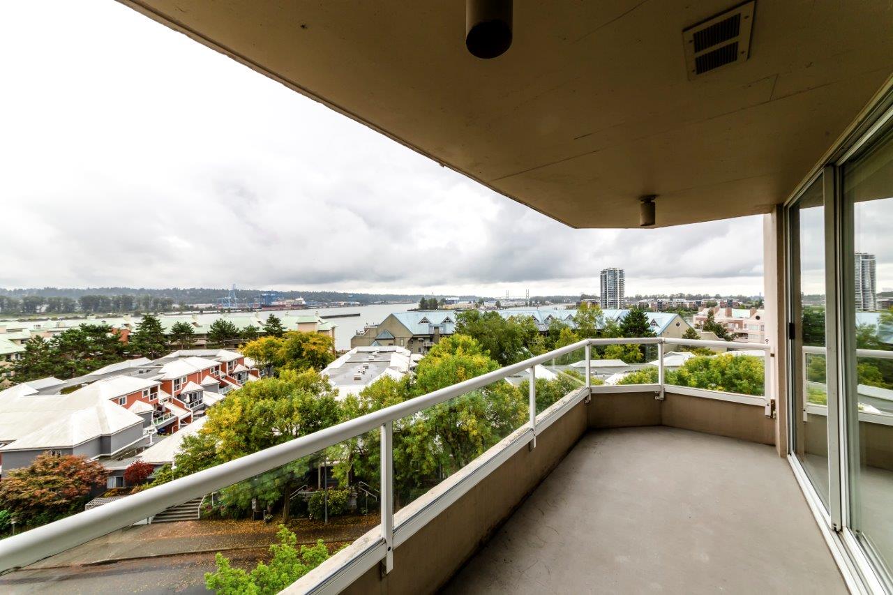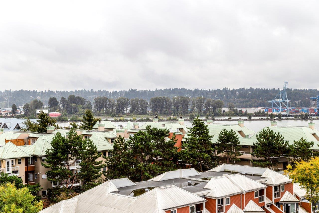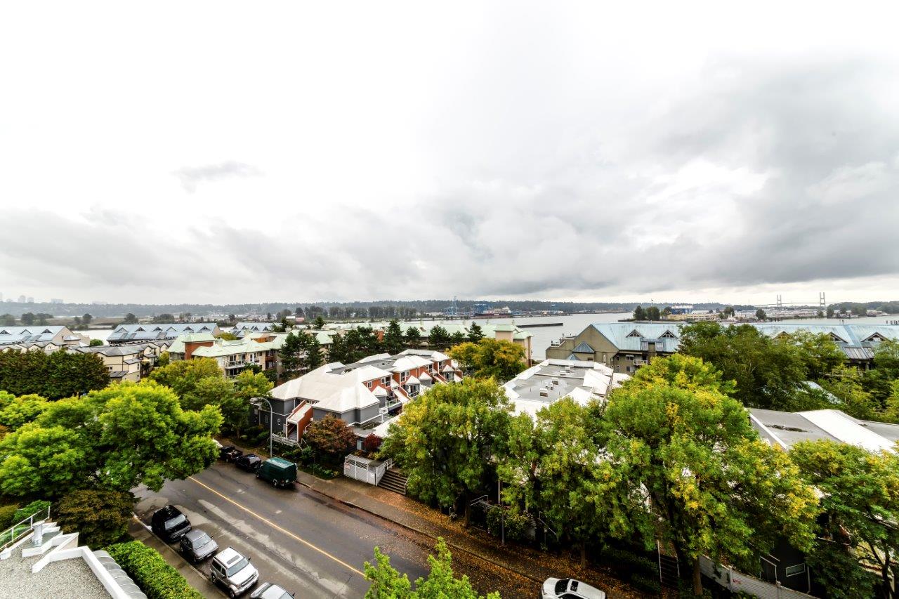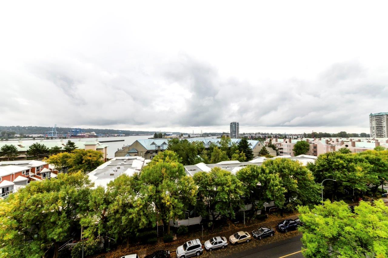 Beautiful panoramic views of the Fraser River! Spacious & bright 2 bdrm (2nd bdrm is large den without closet) Suite in Quayside II. The kitchen features newer countertops with breakfast-bar & new tile backsplash, sink & faucet, newer fridge, self-cleaning stove & dishwasher. Ceramic tile flooring throughout with carpet in living room & master bdrm. Awesome insuite storage & insuite laundry. Extra large view balcony great for BBQ's & entertaining. Located on quiet side of the building. Quayside Tower's amenities - indoor pool, sauna, exercise room & meeting room! New plumbing in the building just completed. Steps to waterfront boardwalk, the Quayside Public Market & SkyTrain. Solid investment & a must see!