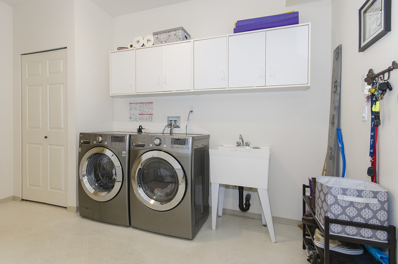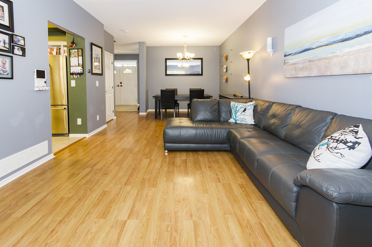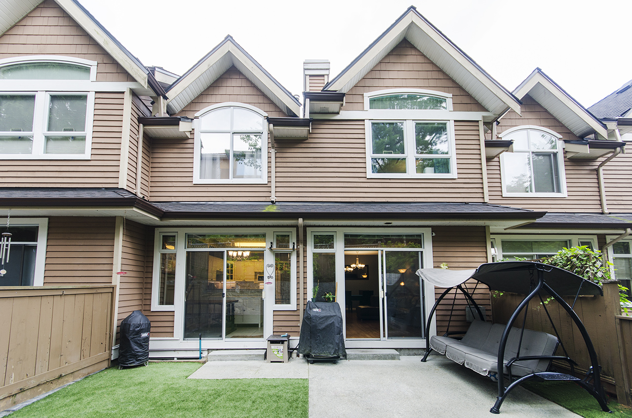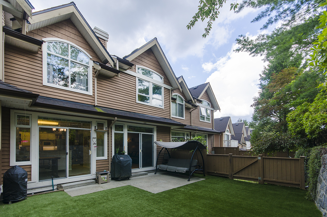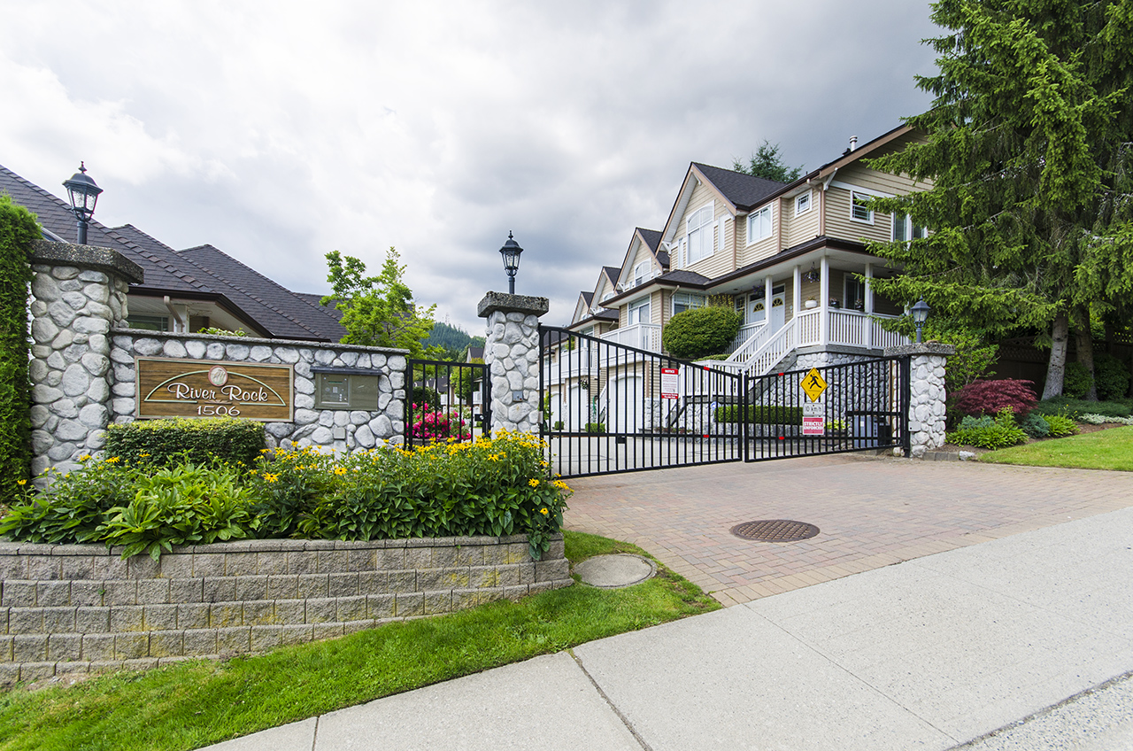 Spacious & bright townhome in the highly sought-after River Rock. A popular gated complex on Westwood Plateau. Almost 2500sq/ft on 3 levels with 4 beds & 3 baths. Updated main features a grand foyer, den/bdrm with sun deck, open dining & living room with cozy gas fireplace & a chefs kitchen with new high-end SS appliances. Opens to a beautiful low maintenance yard with new artificial turf. 3 upstairs bdrms all have stunning vaulted ceilings. The deluxe master has a walk-in-closet & 5 piece ensuite. Basement has laundry room with sink & a brand new washer/dryer. Over-sized tandem garage. Lower floor is an open canvas to easily create the perfect media room, man cave, office or kids play room. Excellent location. Border of Port Moody/Coquitlam. Close to schools & transit. Feels like a house!